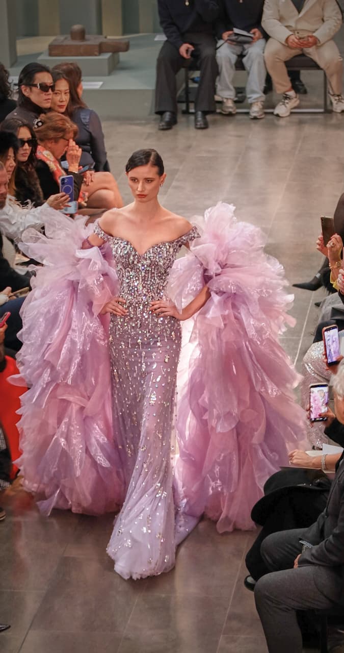 واحتضن العرض متحف Musée national des arts asiatiques – Guimet، ليمنح التجربة بعدًا يتجاوز الموضة إلى الثقافة، ويتجاوز الشكل إلى الدلالة. هناك، تحوّلت المنصة إلى مسار سردي يبدأ من العتمة ويتقدّم تدريجيًا نحو النور، في محاكاة بصرية لرحلة المرأة مع ذاتها، وصراعها الصامت مع الخوف، والخذلان، والبحث عن المعنى.