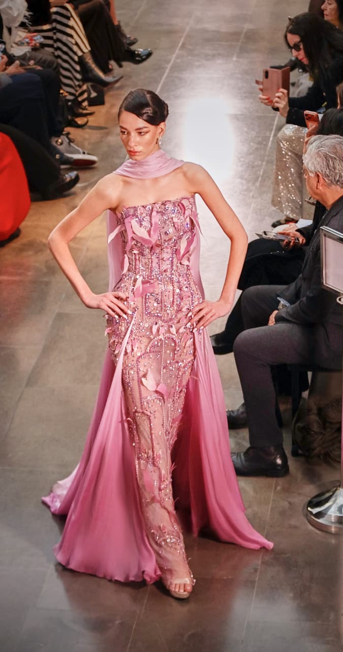 على المستوى الفني، تنوّعت القصّات بين الجريئة والانسيابية، في توازن دقيق يُبرز جمال الجسد دون أن يختزله. أقمشة صيفية حسّاسة مثل الكريب، التافتا، الدانتيل، والموسلين، حضرت كمساحات تنفّس، فيما جاءت التطريزات اليدوية كآثار ضوء على القماش، لا للزينة فقط، بل لتأكيد جدلية الصلابة والنعومة التي تشكّل جوهر المجموعة.